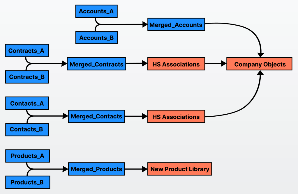 Figure 4. A mockup of data merge logic of the two legacy CRMs and how the merged set was populated in HubSpot.