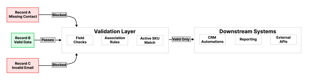 | Data Integrity & Structure | Mismatched data and quantity of missing records dropped sharply following implementation of validation rules and automations. | Cross-object checks and automated guardrails kept inconsistent entries from flowing between systems. Records were created automatically at the stages they previously would have required manual input. |