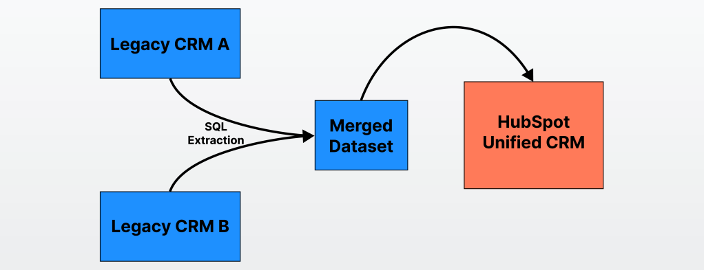 Figure 1. A diagram displaying two legacy CRMs being merged into a HubSpot CRM.