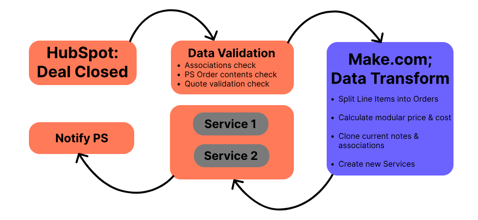 | Rationale | HubSpot has workflow limitations that would have required costly custom development and maintenance to achieve desired functionality. HubSpot ensures permission control, record-state awareness, and audit history; Make handles multi-object logic, order creation, and cross-system API calls. |